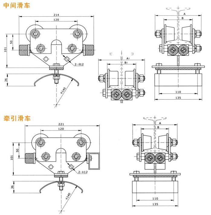 GHC系列工字鋼電纜滑車分為中載荷型、重載荷型、和輕載荷型,因此滑車走輪為Ф80、Ф63、Ф50的三種,承載能力≤50~150kg,每類按托板層數(shù)分為單層、雙層、三層,每類中有三種形式,首端為電纜牽引車,終端為固定掛線架,中間為電纜滑車。